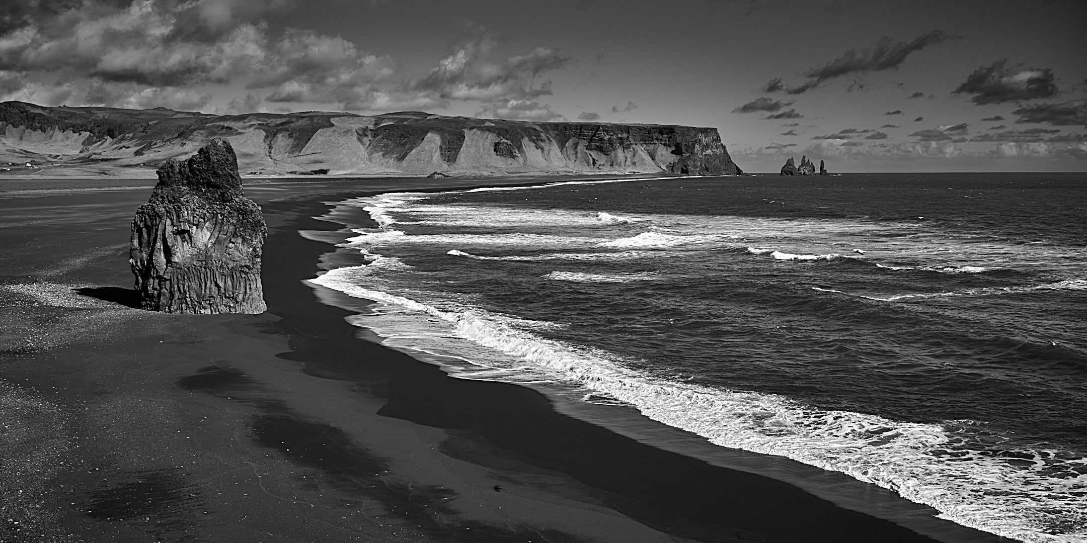 Situated along Iceland's dramatic southern coastline, Fálkaklettur stands as a distinctive geological formation within the ebony sands that stretch between the iconic landmarks of Dyrhólaey and Reynisfjara (Black Sand Beach). This solitary rock formation has become a notable waypoint for visitors exploring the region's striking volcanic landscape and pristine black sand beaches.