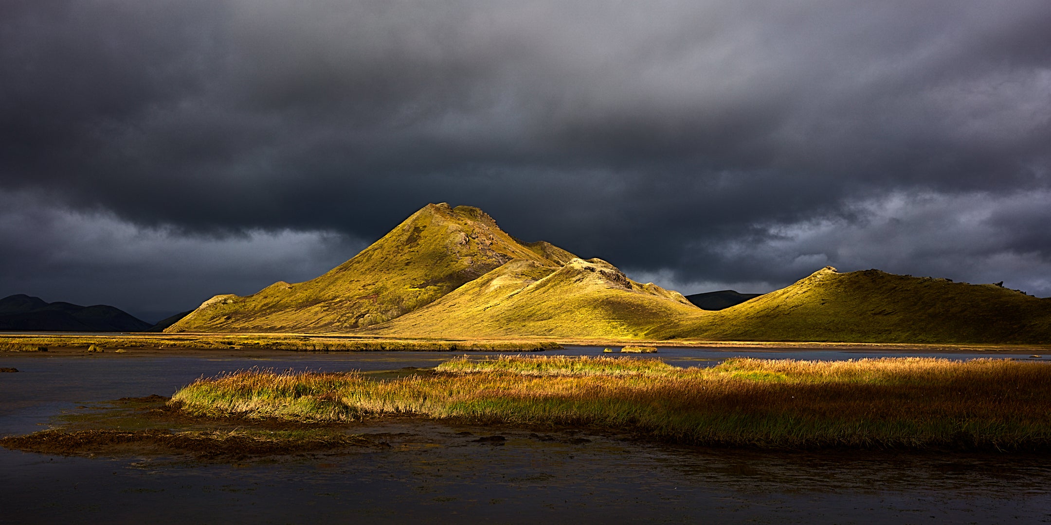 Located just east of Landmannalaugar are Kýlingavatn and Litlikýlingur. Sunlight emerges through the clouds to illuminate Litlikýlingur, while the surrounding cloudy sky provides a contrasting backdrop to the mountain.