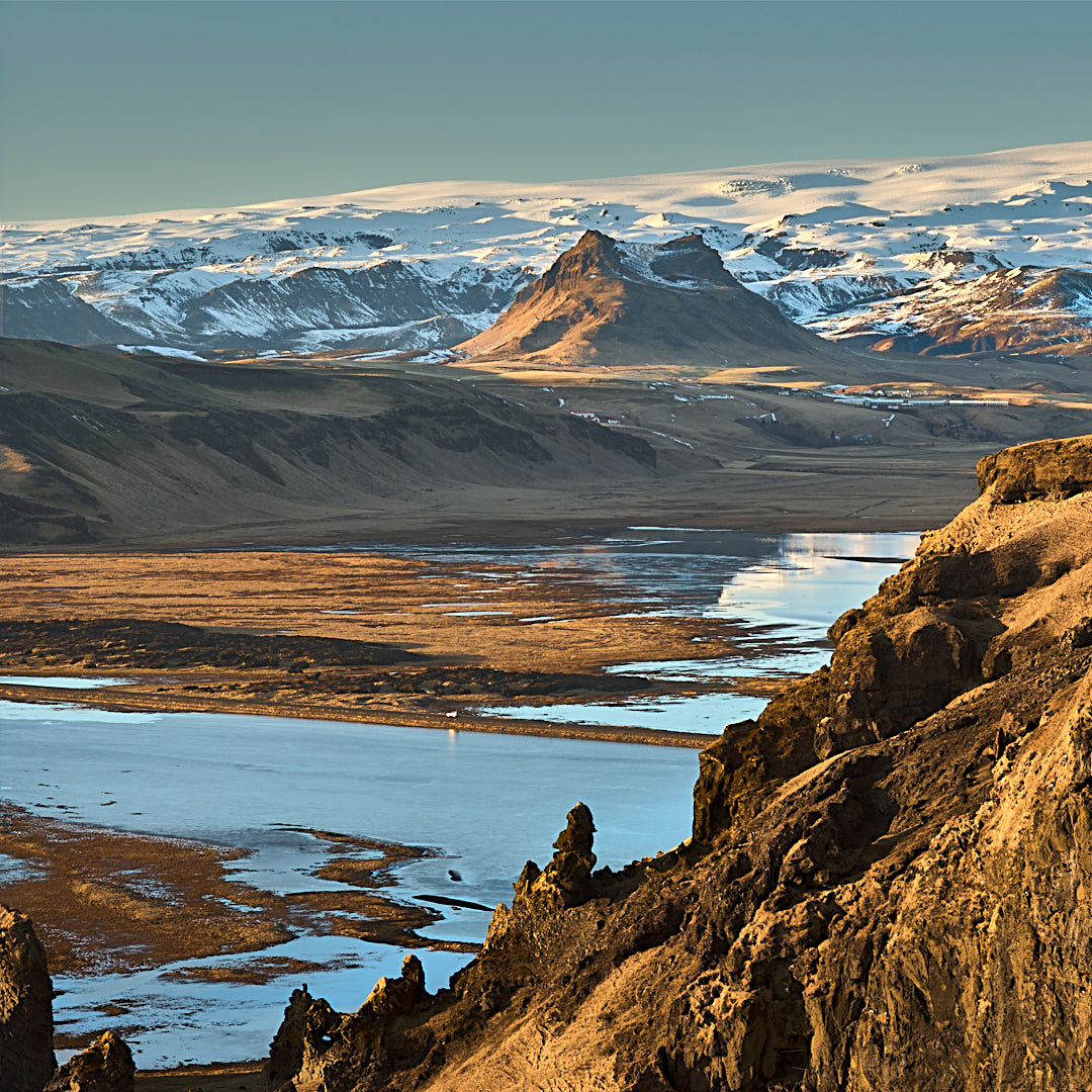 Dyrhólaey is a prominent tourist destination located on Iceland's south coast. The image displays the view from Dyrhólaey toward Mýrdalsjökull.