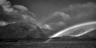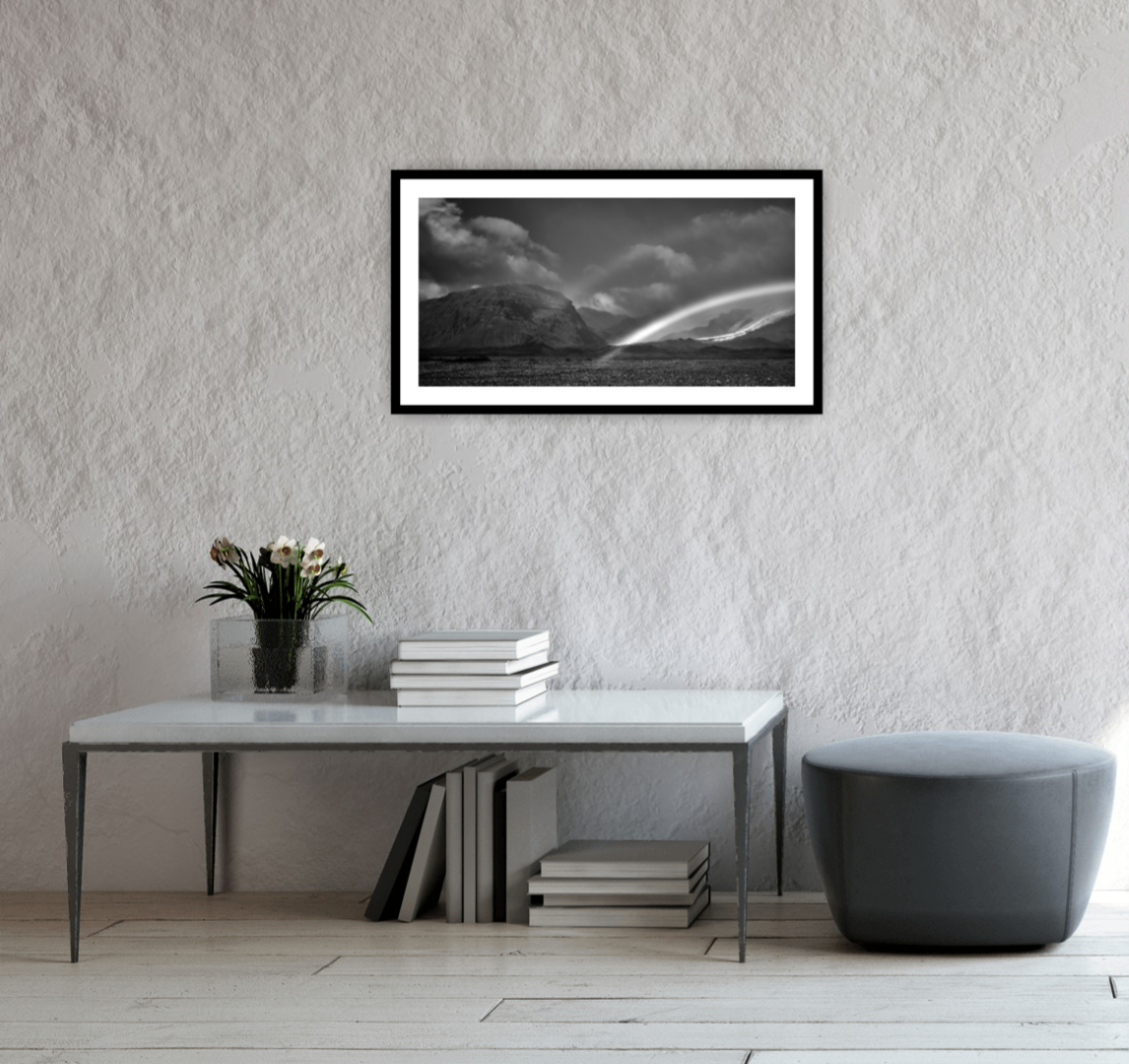 Numerous glaciers descend from Vatnajökull, including Fallfjökull, which glistens beneath the rainbow. A dense layer of clouds hangs over the main glacier, while in the foreground, you can see traces of one of the many streams that flow from it.